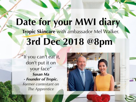 Ambassador Mel Walker will be introducing us to Tropic Skincare products: skincare – body care – gift collections – makeup – tanning – travel – so sleepy.