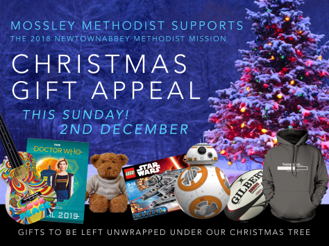 Mossley Methodist continues to support the Newtownabbey Methodist Mission Gift Appeal. Toys and money donations will be gladly received at tomorrow’s Sunday service, after which will be taken to the organisers at the Mission.