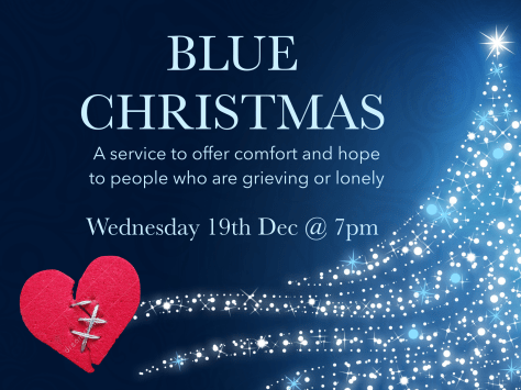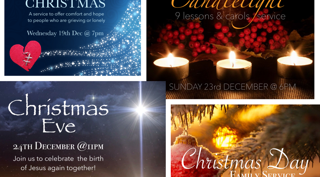 Beginning with Wednesday 19th at 7pm, Blue Christmas… Sunday Advent morning service 23rd At 11am… Sunday 23rd at 6pm, Candlelight Carol Service – mince pies to follow… Christmas Eve service at 11pm… Christmas Day service at 10am.