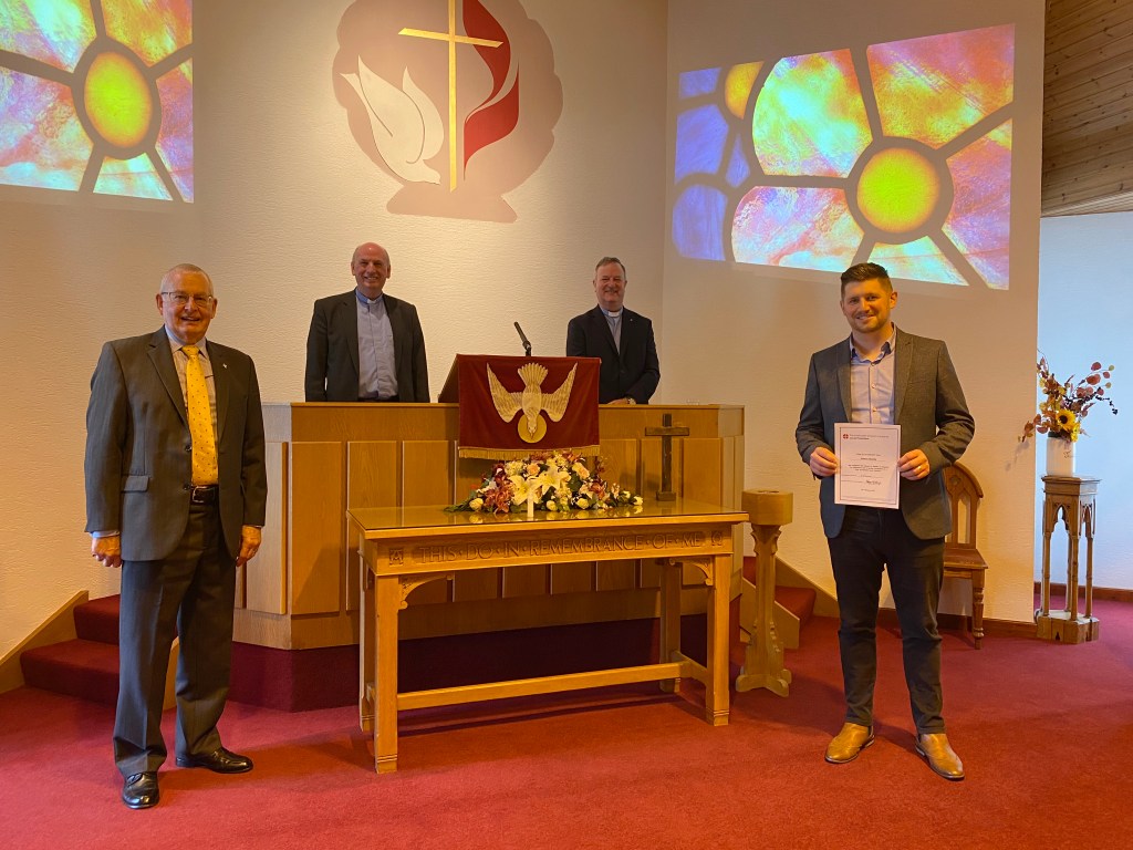 Our Church service in Mossley this morning saw Simon Gowdy being recognised as a fully accredited Local Preacher by the Methodist Church in Ireland. The Service and presentation was resided over by Superintendent Rev Billy Davison, while scriptures were read by Lay Leader of the North Eastern District and Local Preacher Secretary Mr Tom Wilson.