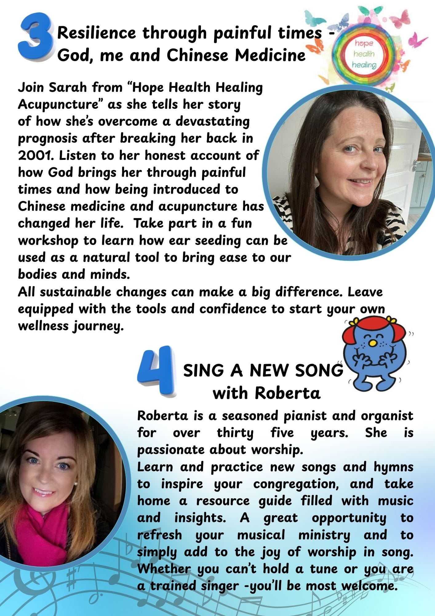 Refresh your musical ministry with seasoned worship leader Roberta. Learn new songs and hymns, and take home a resource guide. All voices welcome—trained singers and joyful noise-makers alike!